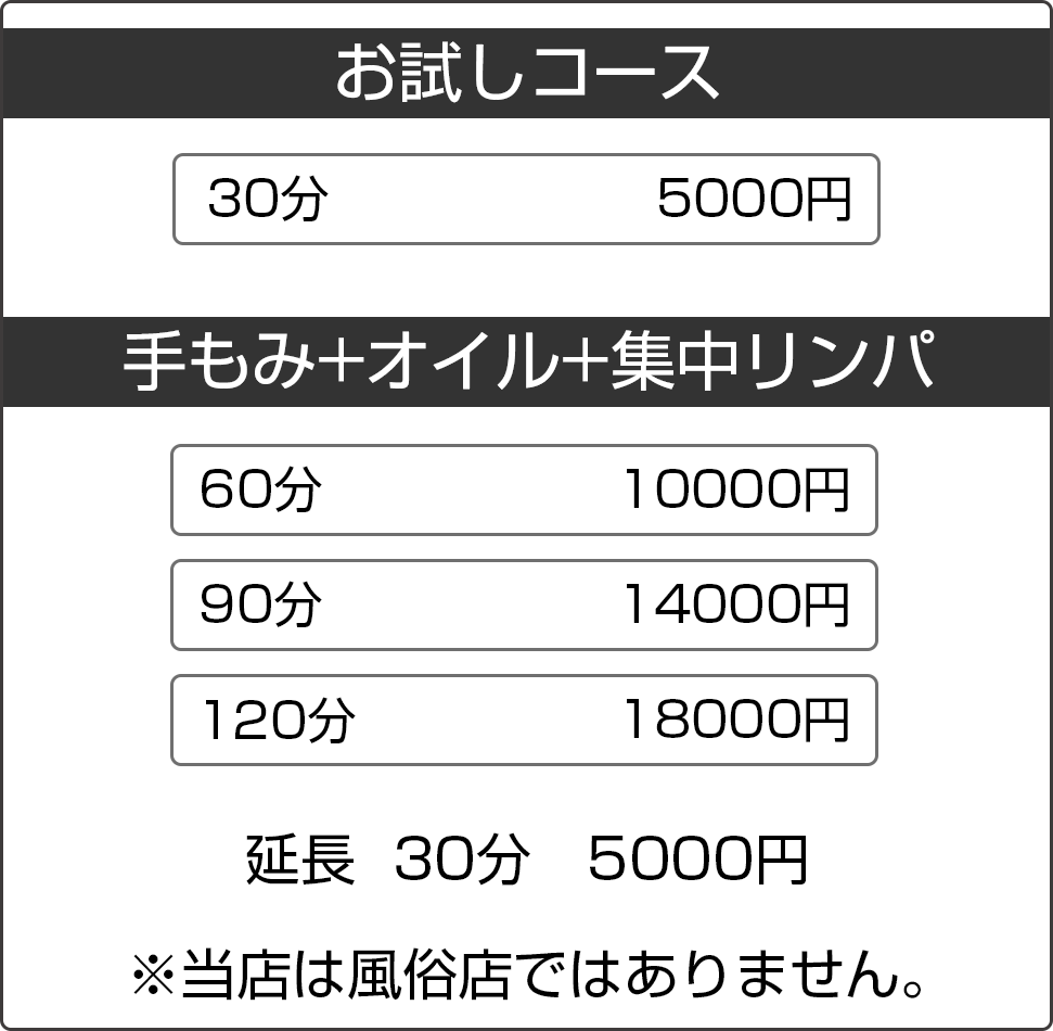 | その他 | 当サロンは風俗店ではございません。 また、回春などのサービスも一切ありません。 |